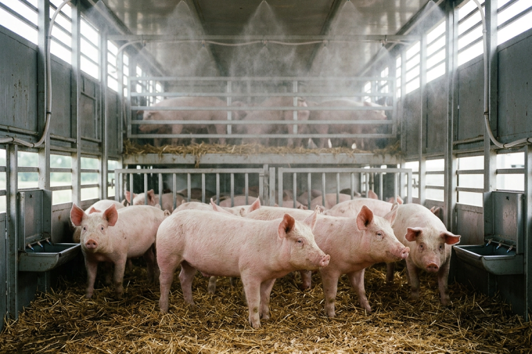Ein besonderes Highlight ist unser Hochdruck-Sprühnebelsystem: Es sorgt für angenehm gekühlte und zugleich keimarme Luft. Dadurch wird das Stall- und Transportklima deutlich verbessert – für gesündere Tiere und mehr Effizienz in der Tierhaltung.